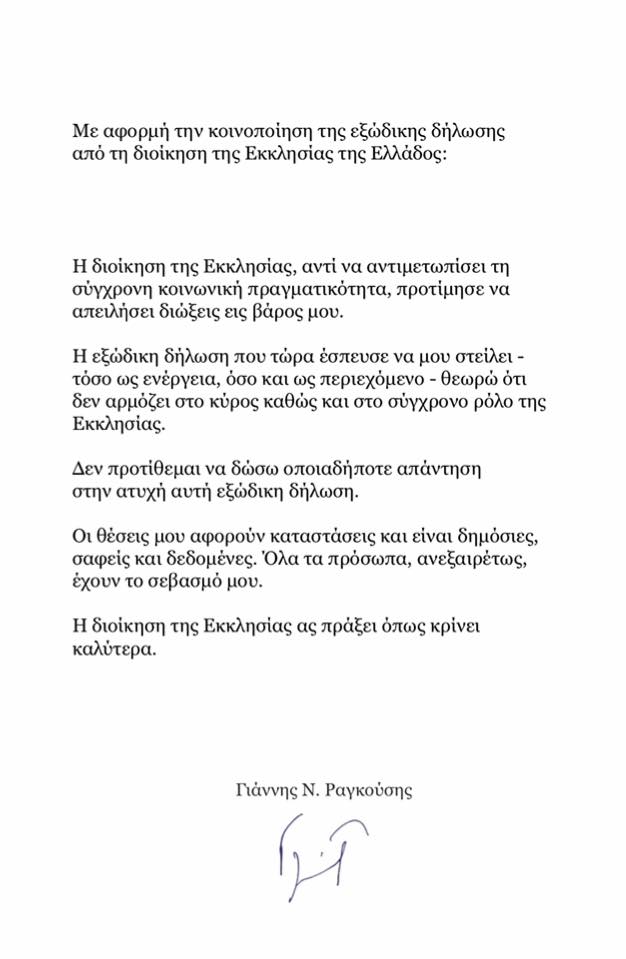 Μετά την εξώδικο πρόσκληση που δέχτηκε ο πρώην Υπουργός της κυβέρνησης του Γιώργου Παπανδρέου και υποψήφιος Πρόεδρος της Δημοκρατικής Συμπαράταξης Γιάννης Ραγκούσης, από την Εκκλησία της Ελλάδος, με αφορμή τις δηλώσεις του ότι υπάρχουν Μητροπολίτες που είναι ομοφυλόφιλοι, προέβη στην παρακάτω απάντηση.