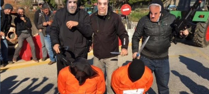 Στο Αγρίνιο, μάλιστα, έκαναν και ένα... δρώμενο αναπαριστώντας εικόνες σαν και αυτές που βλέπουμε στα βίντεο δολοφονίας των τζιχαντιστών. Στο ρόλο του δήμιου ο Αλέξης Τσίπρας, ο υπουργός Εργασίας Γιώργος Κατρούγκαλος και ο υπουργός Αγροτικής Ανάπτυξης Βαγγέλης Αποστόλου οι οποίοι «αποκεφαλίζουν» τους αγρότες με την πορτοκαλί στολή.